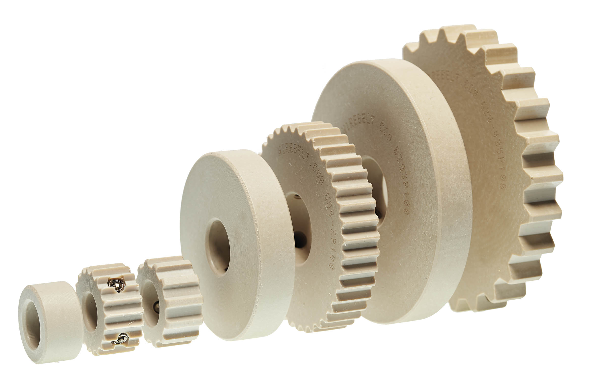 Unsere PEEK Reihe ist für alle Antriebskomponenten erhältlich, einschließlich: Zahnräder, Antriebs- und Umlenkscheiben.
